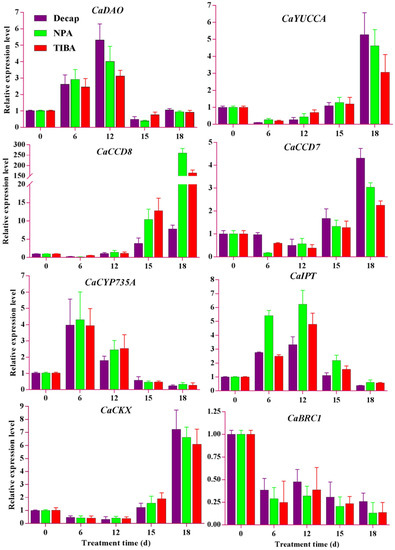 To elucidate the relationship between hormone level changes and lateral bud elongation at the molecular level, we used auxin transport inhibitors (NPA and TIBA) and decapitation treatment to investigate the regulation mechanism of endogenous hormones on lateral bud break. Ten DEGs (seven plant hormone metabolism-related genes and three related transcription factors) were for the qRT-PCR analysis. The qRT-PCR results showed that decapitation, NPA, and TIBA treatments upregulated the expression of CaDAO at the transition stage (Figure 8), indicating that the auxin level decreased through the oxidative degradation pathway in the lateral buds. At this stage, the zeatin content rapidly increased due to the upregulation of CaCYP735A and CaIPT (Figure 8). On the sixth day of treatments, CaCCD7 and CaCCD8, which are key genes for the synthesis of strigolactone, were inhibited (Figure 8). This might be related to the decreased levels of auxin. At the bud break stage, CaCYP735A and CaIPT were downregulated. In contrast, CaYUCCA, CaCCD7, CaCCD8, and CaCKX were upregulated (Figure 8). This is very likely to be related to the competition between growing buds. The synthesis of strigolactone in the growing shoots acts on the subordinate bud to consolidate its apical dominance, which is mediated by auxin.