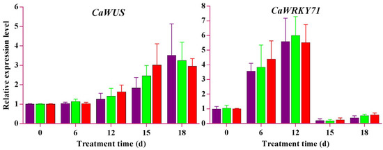 The DEG profiles showed that CaWRKY71 was highly expressed at the TD2 stage, with little expression at the TG2 stage (Figure 7). The qRT-PCR results also showed that CaWRKY71 was upregulated at the transition stage (Figure 8), and downregulated after treatment for 15 days. Interestingly, opposite trends were observed for the expression level of CaWRKY71 and the IAA content (Figure 3C). This indicates that CaWRKY71 might also be regulated by auxin.
