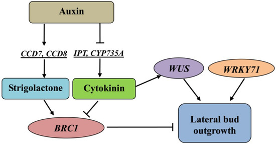 - Tanaka, M.; Takei, K.; Kojima, M.; Sakakibara, H.; Mori, H. Auxin controls local cytokinin biosynthesis in the nodal stem in apical dominance. Plant J. 2006, 45, 1028–1036. [Google Scholar] [CrossRef] [PubMed]