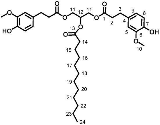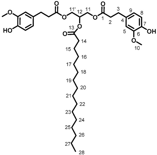 Ferulic acid, lauric acid, palmitic acid, stearic acid, glycerol, benzyl bromide, N,N-dimethyl-4-aminopyridine (DMAP), and N,N-diispropylcarbodiimide (DIC) were purchased from Sigma-Aldrich (Saint-Louis, MO, USA). Candida antarctica Lipase B immobilized on resin (LC200291, 10,000 propyl laurate units g−1) was obtained from Novozyme. Reagents were used as received. All solvents were bought either from ThermoFisher Scientific (Waltham, MA, USA) or VWR France (Fontenay-sous-Bois, France). Deuterated chloroform (CDCl3) was purchased from Euriso-top (Saint-Aubin, France).