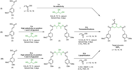 As we committed ourselves to the use of sustainable processes for the production of the targeted bisphenols, the use of the previously reported lipase-catalyzed synthesis of IDF, PDF, and BDF was envisaged [23]. Indeed, the use of immobilized lipase CAL-B as a biocatalyst is a great tool for the development of sustainable processes. Not only does CAL-B not require a solvent, it is inactive toward phenolic hydroxyl groups, but can also be reused for further reaction cycles. In addition, CAL-B has been proven to promote the easier (trans)esterification on esters rather than acids moieties. Hence, α,β-saturated ethyl ferulate (aka ethyl dihydroferulate) and fatty acid ethyl ester (FAEE) were selected as starting materials rather than the corresponding acids. Several strategies were investigated to determine the best synthetic pathway to GDFx. The different pathways (Figure 7) are the