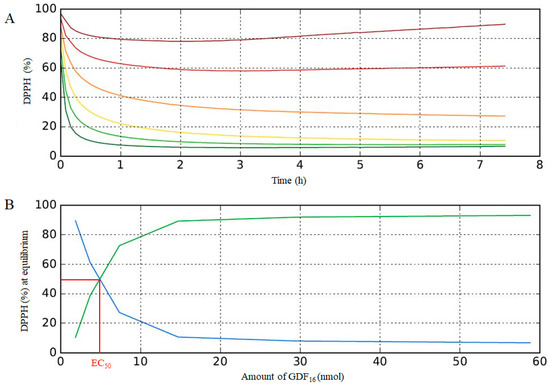 (A) Reaction kinetics of GDF16 solution at given concentrations: 300 µM (dark green), 150 µM (light green), 75 µM (yellow), 37.5 µM (orange), 18.8 µM (red), and 9.4 µM (brown), (B) EC50 determination for GDF16. Blue line: 2,2-diphenyl-1-picrylhydrazyl (DPPH) radical and Green line: RPPH reduced.
