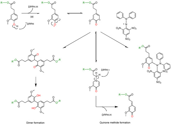 The stoichiometry value n does not coincide with the number of hydroxyl groups available. Indeed, the direct abstraction of the phenol H-atom and the electron transfer process from ArOH to DPPH radical is not the only mechanism involved in the reaction between DPPH and phenols. Various studies [31,32] have already proposed potential phenol regeneration pathways leading to reaction products such as dimers or quinone methides, able to further react with DPPH radicals and thus leading to n values higher than 2 (Figure 9).