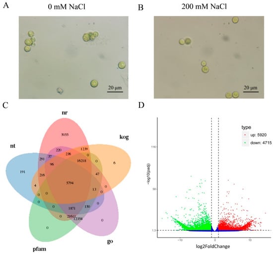 (A) The morphology of C. reinhardtii cells without addition of NaCl. (B) The morphology of C. reinhardtii cells under 200 mM NaCl treatment. (C) Venn diagram of functional annotations of unigenes in nt (NCBI non-redundant protein sequences), nr (NCBI non-redundant protein sequences), kog (Clusters of Orthologous Groups of proteins), go (Gene Ontology) and pfam (Protein family) databases. (D) Expression patterns of differentially expressed genes (DEGs) identified between 200 mM NaCl treated and control. S_200 indicated cells under 200 mM NaCl stressed condition for 24 h; C_0 indicated cells cultured under control condition. Red and green dots represent DEGs, blue dots indicate genes that were not differentially expressed. In total, 10,635 unigenes were identified as DEGs (padj < 0.05) between S_200 and C_0, including 5920 upregulated genes and 4715 downregulated genes.