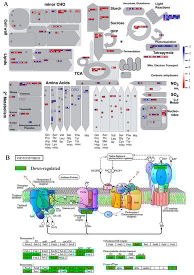 - Thimm, O.; Blasing, O.; Gibon, Y.; Nagel, A.; Meyer, S.; Kruger, P.; Selbig, J.; Muller, L.A.; Rhee, S.Y.; Stitt, M. MAPMAN: A user-driven tool to display genomics data sets onto diagrams of metabolic pathways and other biological processes. Plant J. Cell Mol. Boil. 2004, 37, 914–939. [Google Scholar] [CrossRef]