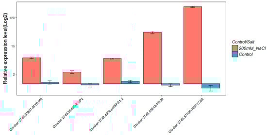 To verify the RNA-seq results, an alternative strategy was selected for the upregulated unigenes. In total, five over-expressed unigenes were randomly selected for validation by qRT-PCR using the same RNA samples that were used for RNA-seq. Primers were designed to span exon-exon junctions (see Supplementary Table S6 and Figure S3). In most cases, the gene expression trends were similar between these two methods; the result is shown in Figure 3. The ortholog of cytosolic small heat shock protein encoding genes HSP17.6A, Cluster-2749.57700, which was detected by RNA-Seq as up-regulating genes in the salt treated samples (L2fc = 9.76), was also detected to be significantly over-expressed by qRT-PCR method (Figure 3).