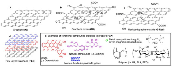 The summary of structural models of various graphene derivatives. (a) Pristine graphene (G), (b) graphene oxide (GO); (c) reduced graphene oxide (G-Red); (d) few-layer graphene (FLG); (e) some examples of functional compounds exploited to prepare Functional Graphene Nanomaterials (FGN).