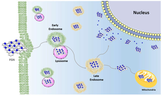 The functionalization of FGN can influence their interaction with cells not only by affecting the surface properties in terms of hydrophobicity/hydrophilicity but also by promoting a specific interaction with receptors (targeting). The functionalization of G-Red with the surfactant poly (sodium 4-styrenesulfonate) (PSS) was proposed as a tumor-targeted nanocarrier for epirubicin (EPI). The uptake of the platform PSS-G–EPI in human breast cancer cell lines (MCF-7) took place mainly by the endosome-mediated endocytosis pathway, which is slower than the direct diffusion of free EPI into the tumor cells. In fact, after internalization, the nanocarrier is transferred to lysosomes in 2 h, then released in the cytoplasm in 8 h, and eventually delivered into the cell nucleus to exhibit biological effects in 24 h [33]. The functionalization with dextran on G-Red surfaces was proposed to obtain an antigen delivery carrier for cancer immunotherapy with good water dispersibility, high antigen loading, and efficient cellular uptake via endocytosis by interaction with carbohydrate receptors on the surfaces of dendritic cells [34].