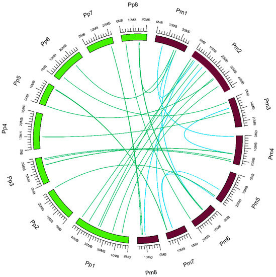 Syntenic relationships among UGTs in P. mume and P. persica. Chromosome are shown in the outer circle, with Pm1–8 and Pp1–8 indicated in brown and green, respectively. Genome-wide duplicated UGTs in P. mume are connected by blue lines. Genome-wide duplicated UGTs between P. mume and P. persica are connected by green lines.