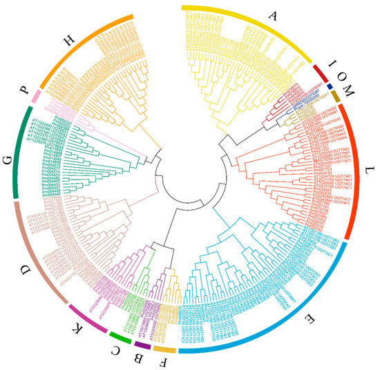 Plant genomes contain numerous UGT genes, with UGT members varying among species. For example, 107 UGTs have been identified in A. thaliana [9] and 191 in P. trichocarpa [19]. Members of the UGT multigene family have also been recently identified in peach (168), grape (184), kiwifruit (188), strawberry and apple (254) [12,13,38,39,40]. In the present study, 130 UGTs were uncovered in P. mume, all containing the conserved PSPG box.