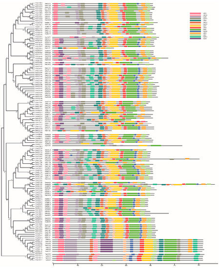 According to the general feature format file of P. mume, the exon-intron structures of the PmUGTs were obtained and graphed with the Gene Structure Display Server (GSDS: available online: http://gsds.cbi.pku.edu.ch). The conserved motifs of the putative UGT proteins were predicted by using the on-line MEME procedure with maximum 15 motifs per sequence. The sequence logo was obtained using the online Weblogo platform (available online: http://weblogo.berkeley.edu).
