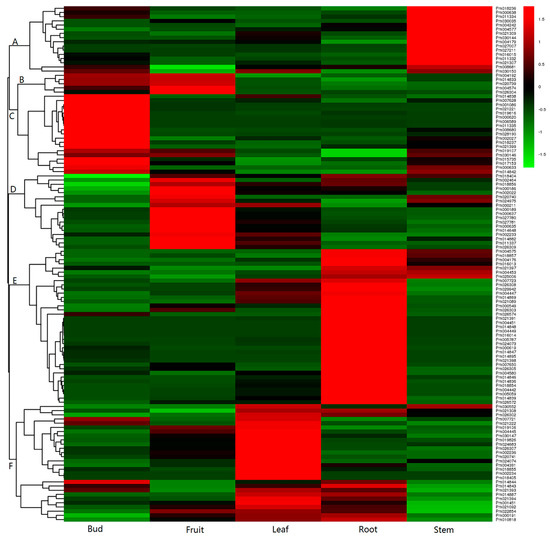 To detect the expression differences of PmUGTs, we analyzed their transcript abundances in bud, fruit, leaf, root and stem according to RNA-seq data. After filtering the low and missing expression values, 123 PmUGTs were finally examined to be expressed across the different tissues. Through hierarchical clustering analysis, these 123 PmUGTs were grouped into five discrete clusters in the five tested tissues (Figure 5). The expressed 16 PmUGTs in cluster A showed consistent downregulated expression patterns in bud, fruit, leaf and root but upregulated patterns in stem. The expression levels of 24 PmUGTs in cluster B were relatively higher in bud and fruit when compared with other tissues. In cluster C, 18 UGTs were detected to display upregulated expression level only in bud, with relatively low levels in other four tissues. PmUGTs in Cluster D, with the largest number of 37, exhibited upregulated expression in fruit; while 28 PmUGTs in Cluster E displayed upregulated expression in root and Cluster F showed high level in leaf (Figure 5).