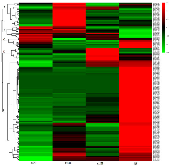In the present paper, we also displayed the PmUGTs expression profiles at four dormancy stages: EDI (with no flush sign in the phytotron), EDII (with 45% flush rate), EDIII (with 95% flush rate) and NF (natural flush). More details can be seen in Zhang et al. [37]. The expression profiles of PmUGTs during bud dormancy transition were hierarchically clustered into five groups (Figure 6). Cluster A (including 19 PmUGTs) exhibited highest levels at EDII and then gradually decreased as dormancy release progressed. Nine genes in Cluster B had highest level at EDI stage and then maintained relatively lower level at EDII, EDIII and NF stages. Cluster C genes showed highest expression level at EDI and sharply decreased at EDII and EDIII. After dormancy released, these genes subsequently increased at NF stage. The 10 PmUGTs in cluster D displayed relatively low expression levels at the EDI and EDII stages and then increased sharply at EDIII and maintained relatively high level at NF stage. Cluster E contained the large number of PmUGTs (80 genes). These genes showed relatively low expression level at dormancy stages and sharply increased once the dormancy completely released.
