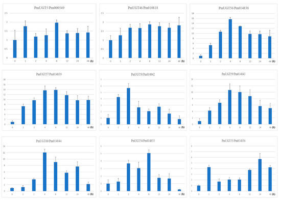 Expression patterns of PmUGTs in response to ABA treatment. The relative expression level of nine group E genes was examined by the RT-qPCR and normalized with the reference gene PP2A. Relative expression of 9 genes under ABA treatment at 0, 1, 2, 4, 8, 12, 24 and 48 h. The error bars represent standard deviations, y-axis are scales of relative expression level and x-axis are the time course (h) of ABA treatment.