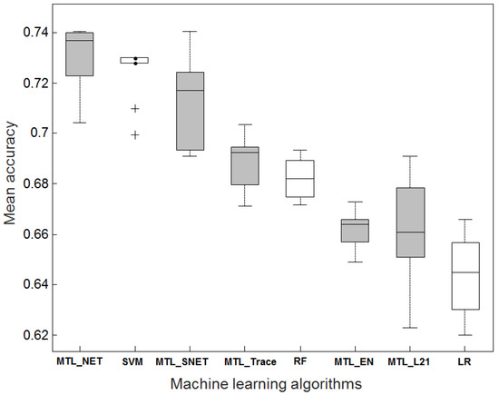 Predictive performance comparison between eight algorithms. The ‘leave-dataset-out’ procedure was used for comparison. Four out of five datasets were combined for training, and then the model was tested on the remaining dataset. The distribution of accuracy estimates indicated the variation of parameter selection across 10 repetitions. The boxplots in gray denote the multi-task learning algorithms.