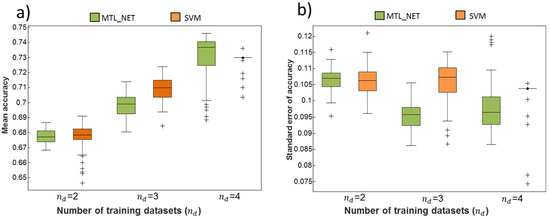 Distribution of classification accuracies and their standard errors across different numbers of training datasets. The Figure shows the mean (a) and standard error (b) of classification accuracies obtained for different numbers of training datasets (). Performance was evaluated from the test datasets not used for training. The variation of the boxplot was due to the sampling variability during cross-validation.