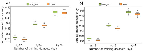 Figure 3a,b show that, in terms of vertical and horizontal consistency, MTL_NET outperformed SVM, independently of the number of training datasets. This indicated that similar discriminative patterns of genes were identified by MTL across training datasets, and implied strong robustness against cross-dataset variability. In particular, the superior performance of vertical consistency for MTL_NET showed that this algorithm was less sensitive to the small numbers of training datasets compared to SVM. Table 1 shows the mean consistency (both horizontal and vertical) across bootstrapping samples. Compared to SVM, MTL_NET achieved a higher mean consistency by approximately 1.6% for horizontal and 2.2% for vertical consistency. Notably, the success rate of consistency was 100%, independent of the number of training sets, showing that MTL_NET models consistently identified higher transcriptomic profile robustness across bootstrapping samples than SVM.