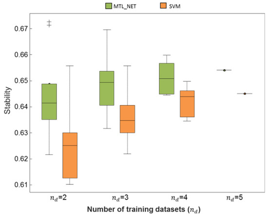 To further identify the robustness of models against sampling variability, we quantified the algorithms’ stability. In Figure 4, across the number of training datasets, nd, the increasing trend of stability demonstrated that both MTL_NET and SVM gained more robustness against sampling variability with an increasing number of subjects used for training. However, MTL_NET demonstrated higher stability than SVM independently of the number of training datasets (Figure 4). The mean stability across models also supported the result (Table 1). Moreover, the mean stability for MTL_NET was 1.2% higher than SVM (100% success rate of stability across all nd, Table 2).