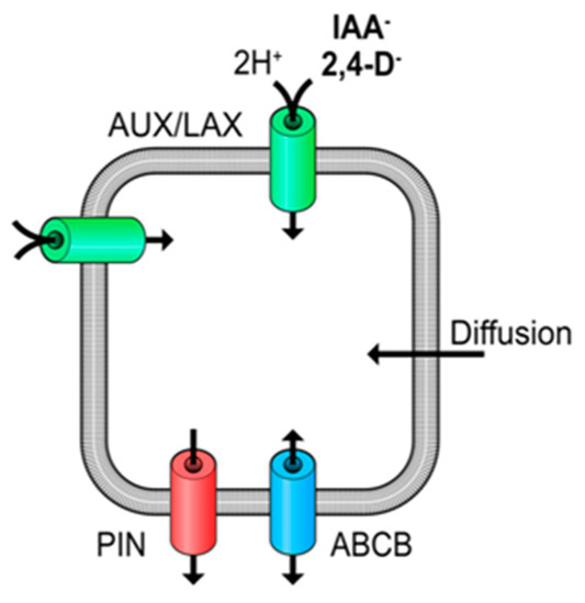 Natural and synthetic auxins are weak acids (e.g., indole-3-acetic acid, IAA pKa = 4.7) and, as a consequence, a significant proportion will be protonated and uncharged at regular apoplast pH values of between 4.5 and 5.5 [16]. This may allow the molecule to diffuse across the PM, and this diffusive flux is widely recognized, although cellular uptake via auxin transport proteins is also necessary and vitally important (Figure 1) [17,18]. The cytoplasm has a pH close to neutral, and at this pH IAA will be deprotonated and become anionic, trapped in the cell by the well-known anion trap and dependent on transport proteins for exit [17]. The seminal work of Rubery and Sheldrake [17] uncovered most features of the mechanisms of auxin transport that we understand today. They used plant cell suspension cultures to follow the accumulation kinetics of radiolabelled auxin and showed that uptake was pH-dependent. This led them to propose that there is probably IAA-proton co-transport. Further, they showed that uptake was saturable and, hence, carrier mediated. Moreover they estimated the half saturation concentrations for IAA and 2,4-D to be low micromolar, and they calculated that the anion trap would concentrate IAA− in the cytoplasm above the concentrations of IAA in both apoplast and vacuole. In this review we will discuss what details have been added to these early discoveries.