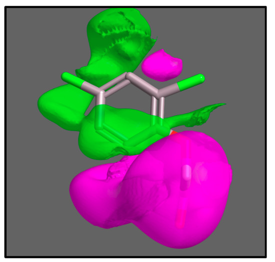 The AUX1 pharmacophore. The pharmacophore is a three-dimensional map of the characteristics of all known substrates of AUX1 [44]. The activity cliff map for hydrophobicity is shown with the structure of 2,4-D inside as a reference compound. The volumes coloured green indicate spaces where additional hydrophobicity increases activity (compounds filling these spaces with hydrophobic groups are better substrates for AUX1); the volumes coloured magenta indicate spaces where hydrophobicity decreases activity.