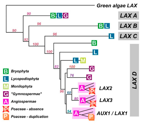 The AUX1/LAX phylogenetic tree. A summary of the maximum-likelihood phylogenetic analysis of nucleotide sequences using a GTR + G + I evolutionary model. Major taxonomic groups are depicted as letters. Node captions indicate bootstrap values.