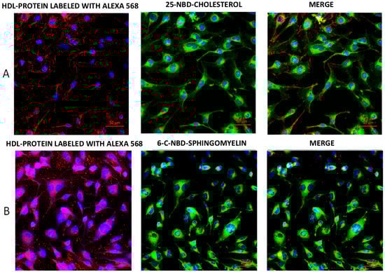 Isolation of native total LDL and total HDL were performed by sequential ultracentrifugation (LDL d = 1.019–1.063 g/mL, HDL d = 1.063–1.21 g/mL) as previously described in References [,] using plasma from healthy volunteers without dyslipidemias (cholesterol < 200 mg/dL, triglycerides < 150 mg/dL), metabolic abnormalities such as thyroid, liver, or renal dysfunction, and no family history of cardiovascular disease or diabetes. Lipoproteins were dialyzed with PBS-saline solution, and protein content was quantified by Lowry’s method. For the internalization assays, HDL were labeled in their protein portion using the Alexa 488 or Alexa 568 protein labeling kit following the manufacturer’s instructions with slight modifications as previously reported [,].