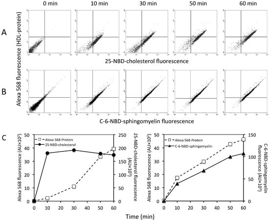 Kinetic assays were performed at 10, 30, 50, and 60 min of incubation time using 25-NBD-cholesterol and Alexa Fluor 568 double-labeled rHDL. After the incubation time, cells were recovered and analyzed by flow cytometry. We took 5000 gated events into account, discarding cell debris and cell associations. Cell morphology was assessed during the entire protocol, and cell size and granularity were verified.