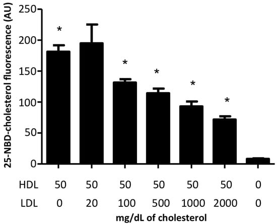 Competition assays between HDL cholesterol and low-density (LDL) cholesterol internalization in HMEC-1. Cultured cells were coincubated with a constant rHDL cholesterol concentration (50 mg/dL) and increasing concentrations (20 to 2000 mg/dL) of cholesterol associated with LDL isolated from human plasma. rHDL were labeled with 25-NBD-cholesterol, and internalization was monitored by flow cytometry. Data correspond to mean ± SD of three independent experiments. * p < 0.05 vs. HDL 50 mg/dL and no LDL.