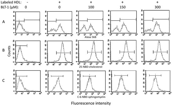 As SR-BI is one of the few accepted HDL receptors, we looked for the contribution of this protein to the internalization of HDL to endothelial cells. These experiments were performed with three different concentrations (100, 150, and 300 μM) of the irreversible SR-BI-inhibitor, block lipid transport-1 (BLT-1), and apo AI-Alexa 568 or 25-NBD-cholesterol or C-6-NBD-sphingomyelin single-labeled HDL (Figure 4). The fluorescence of any of the three components was found within HMEC-1 cells after 30 min of incubation (peaks displaced to the right in Figure 4A–C). At 100 μM of BLT-1, we observed a decrease in the fluorescence corresponding to the labeled protein concomitantly with an increase in the peak of nonlabeled cells (Figure 4A, third panel). This result indicated that 100 μM of BLT-1 induced a partial inhibition of HDL protein internalization. Paradoxically, at higher concentrations of BLT-1, the inhibition of protein internalization did not increase as expected; instead, HDL protein internalization gradually rose in a BLT-1 dose-dependent manner (Figure 4A, fourth and third panels). In contrast to the HDL protein, the whole HMEC-1 cell internalized the 25-NBD-cholesterol, which was not affected by any of the three tested concentrations of BLT-1 (Figure 4B). Concerning sphingomyelin, the coincubation of cells with any of the three concentrations of BLT-1 resulted in wider peaks of labeled cells than those observed in the absence of the SR-BI inhibitor (Figure 4C). These wider peaks are indicative of a more heterogeneous population of cells in terms of the number of internalized fluorescent markers.
