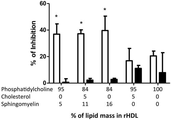 Inhibition of intercellular adhesion molecule-1 (ICAM-1) levels by rHDL after TNF-α stimulation. HMEC-1 was incubated for 4 h with rHDL containing different lipid proportions as indicated in the horizontal axis before TNF-α stimulation. Results are represented as the percentage of inhibition, considering the levels of ICAM-1 induced by TNF-α without rHDL as 100% of expression, then subtracting the ICAM-1 expression levels after rHDL incubation. Results were obtained using the mean of three independent experiments. * p < 0.05 vs. 100 PC/Apo AI.