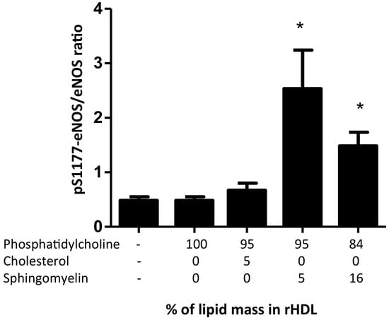 We further focused on the role of HDL in inducing the activation of eNOS, particularly on the phosphorylation of the residue S1177 (pS1177-eNOS). Microscopic analysis of HMEC-1 incubated with rHDL specifically stained for eNOS and pS1177-eNOS are shown in Figure S2. The densitometric analysis of the images demonstrated that the p1177-eNOS to eNOS ratio was dependent on the presence of sphingomyelin in rHDL (Figure 6); however, 5% of sphingomyelin content within rHDL had a better effect than rHDL containing 16% of the lipid. In contrast, rHDL structured with apo AI and phospholipids did not induce eNOS phosphorylation when compared with the control cells, independently of the presence of cholesterol (Figure 6).