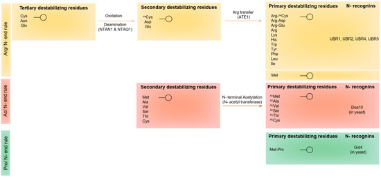 - Eldeeb, M.; Fahlman, R. The-N-end rule: The beginning determines the end. Protein Pept. Lett. 2016, 23, 343–348. [Google Scholar] [CrossRef] [PubMed]