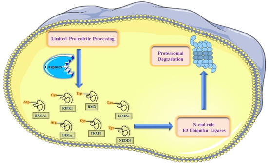 - Piatkov, K.I.; Brower, C.S.; Varshavsky, A. The n-end rule pathway counteracts cell death by destroying proapoptotic protein fragments. Proc. Natl. Acad. Sci. USA 2012, 109, E1839–E1847. [Google Scholar] [CrossRef] [PubMed]