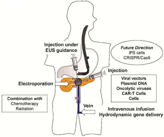 - Vassaux, G.; Angelova, A.; Baril, P.; Midoux, P.; Rommelaere, J.; Cordelier, P. The Promise of gene therapy for pancreatic cancer. Hum. Gene Ther. 2016, 27, 127–133. [Google Scholar] [CrossRef] [PubMed]