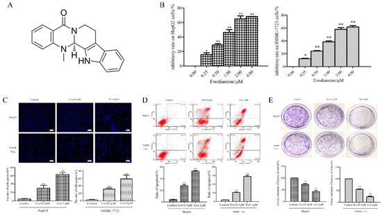 Evodiamine (Evo) inhibits cell viability and induces cell apoptosis in hepatocellular cancer (HCC) cells in vitro. (A) Chemical structure of Evo. (B) HepG2 and SMMC-7721 cells were incubated with increasing concentrations of Evo (0, 0.25, 0.5, 1, 2, and 4 µM) for 24 h. Cell Counting Kit-8 (CCK-8) assay was performed to detect the cytotoxic effect of Evo. (C) Hoechst 33258 staining of HepG2 and SMMC-7721 cells after being treated with Evo (0, 0.5, and 1 µM) for 24 h. Apoptotic cells were identified by the presence of bright-blue fluorescent and highly condensed or fragmented nuclei (×40). (D) Flow cytometry histograms of cell apoptosis distribution after treatment with Evo (0, 0.5, and 1 µM) for 24 h by Annexin V-FITC/PI double staining. (E) Representative images from the colony-formation assay. HepG2 and SMMC-7721 cells were incubated with or without Evo (0, 0.5, and 1 µM) for 24 h and allowed to grow into colonies for another 16 days. Values are means and standard errors of three separate experiments (* p < 0.05 and ** p < 0.01 versus control).