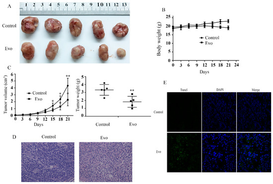 Evo inhibits HCC cells growth in vivo. (A) Representative images of the tumor generated by controls and Evo treatments. (B) Mice body weights were recorded and compared. (C) Tumor volumes were recorded and compared. Tumor weight was obtained at the end of the experiment when mice were sacrificed by dislocation after anesthesia. (D,E) Xenograft tumor tissues were analyzed for hematoxylin-eosin staining (HE) staining (×200) and TdT-mediated dUTP Nick-End Labeling (TUNEL) (×400). Values are means and standard errors of five separate experiments (* p < 0.05 and ** p < 0.01 versus control).