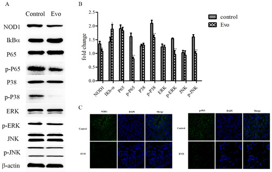To confirm whether the inhibition of Evo on xenograft tumor growth is mediated by blocking the NOD1 pathway we detected the levels of NOD1, IκBα, p-P65, p-ERK, p-p38, and p-JNK proteins in xenografted tumors of mice treated with Evo by Western blot analysis. As shown in Figure 5A,B, levels of NOD1, p-P65, p-ERK, p-p38, and p-JNK proteins were decreased and the level of IκBα was increased in experimental mice compared with control mice. We analyzed tumors by the immunofluorescence method to investigate levels of NOD1 and p-P65. There were decreases in NOD1 and p-P65 levels in xenografted tumors of mice treated with Evo, which was consistent with the data in vitro (Figure 5C).