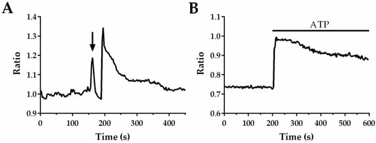The Ca2+ response to ATP or acetylcholine in the intact endothelium of excised rat aorta consists in a biphasic increase in [Ca2+]i, which comprises a rapid Ca2+ transient followed by a plateau phase of intermediate amplitude between the resting Ca2+ levels and the initial Ca2+ response [,,]. Similarly, the Ca2+ signal induced by mechanical injury consists in a rapid Ca2+ peak followed by a long-lasting decline towards the baseline in the majority ECs adjacent to the lesion site. The remaining fraction of cells in the first row also displayed periodic Ca2+ oscillations which overlapped the decay phase and were initiated after the initial Ca2+ spike. Furthermore, repetitive Ca2+ spikes and heterogeneous Ca2+ signals were detected also in ECs further back from the wound edge (see Supplementary Material in Reference []). As discussed elsewhere [], injury-induced intra- and intercellular oscillations in [Ca2+]i might play a key role in healing damaged endothelium by inducing surviving ECs to proliferate and migrate in order to cover the denuded membrane basement.