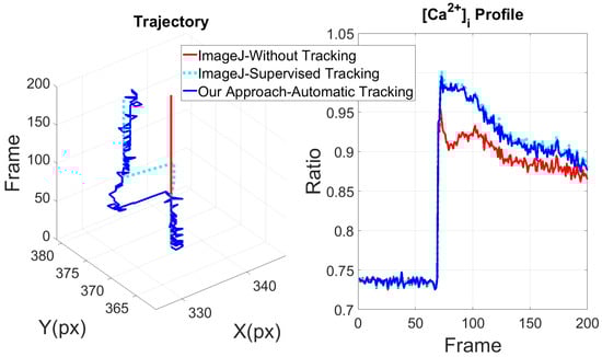 This is a chemical stimulus that has been delivered as described in Materials and Methods. The dimensions of the images are 640 × 480 pixels (px) and they have *. TIFF format. Application of 300 µM ATP to in situ endothelium from rat aorta is able to evoke a biphasic increase in [Ca2+]i, as shown in Figure 2 right (blue line, data obtained with Automatic Tracking approach). However, ECs undergo a little displacement and intensity variations when exposed to bath application of the agonist. For comparison purposes, fifteen cells were selected randomly and their intracellular CPs were obtained using the proposed system and ImageJ program, manually repositioning the ROI every time the cell moves outside of it (ImageJ-Supervised Tracking). The mean square error (MSE) between both obtained data sets is shown in Table 1. Please note that MSE is insignificant compared with the mean of its respective CP extracted with our automated approach (). Although small movements were registered in the cells trajectory, the kinetics of CPs are very similar and the MSE is small, as was expected. This observation demonstrates that this approach, which consists in the simple bath application of the agonist, does not generate significant artifacts and does not induce significant VSMC contraction. It should, however, be pointed out that the magnitude of the initial peak, which is due to Ca2+ release from the endoplasmic release, is significantly larger than the amplitude measured without tracking (red line). Cyan line, represent the CP obtained by using ImageJ-Supervised Tracking. In this particular experiment, the single ROI was repositioned at least 3 times along the experiment. As expected, the CP obtained by ImageJ-Supervised Tracking method, overlaps with the CP obtained with our automated approach. This observation reinforces the notion that automatic tracking is recommendable to speed off-line analysis and to gather all the information content of the Ca2+ signal.