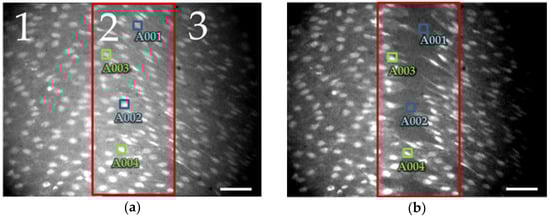 Three zones were considered in the image as shown in the Figure 3a and three cells were selected per zone. Zone 2 represents the area onto which the mechanical lesion is imposed, whereas zones 1 and 3 represent the most proximal regions to the damaged site. The fluorescence and position of cells in zones 1 and 3 display a more stable behavior than cells in the zone 2. Some cells of the inner zone (red rectangle on Figure 3a,b) die and then disappear, please see the transition from Figure 3a to Figure 3b; this is reflected as an OFF-LINE status (i.e., blue A001 and A002 ROIs).