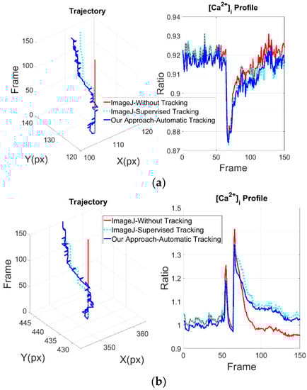 Results per defined zones due to mechanical stimuli: (a) Results obtained from zones 1 and 3; (b) Results obtained from zone 2. (Left), shows trajectories of cells, i.e., calculated position on X and Y axes respectively, measured in pixels (px). (Right), shows typical recordings of CP analyzed by: ImageJ without tracking (red line); with manually tracking (cyan line) and automated tracking proposed system (blue line).