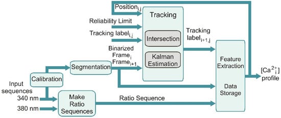 As stated above, Fura-2 has a maximum fluorescence when it is excited with 340 nm wavelength, so the contrast of these images is usually better than the contrast of images obtained with 380 nm excitation. Therefore, the 340 nm image sequence was taken as the basis for the calibration, segmentation, tracking and feature extraction blocks. To guarantee the integrity of Ca2+ measurements, the 340 nm image sequence is modified only right after the ratio sequence was generated. The 380 nm image sequence was used only to generate the ratiometric image sequence.