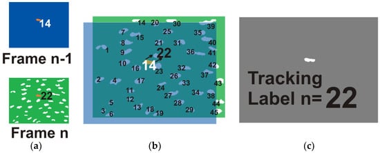 The intersection process to track cells, from frame n-1 to frame n, is illustrated. (a) The kernel of a selected cell with track_label = 14 in frame n − 1 (blue background and orange highlighted) and the binarized and labeled frame n are the input data, notice that the corresponding label for selected cell will be 22; (b) Kernel and binary image are overlapped to show the intersection process, which is a logical and operation between them; (c) The outcome is a new kernel, in this case only one object was generated by the intersection; based on its position in frame n the new track_label value is updated to 22. This iterative process is performed per each selected cell (ROI) and each frame.