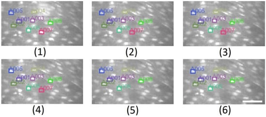 Tracking results through six consecutive frames. Eight cells were selected by the user, only ONLINE cells are labeled, ROI surrounded and tracked. OFFLINE cells are not tracked as shown with cell A007; the cell is visible at frame (1), then it vanishes as of frame (2) and its reliability counter increases by one between frames (2–4). At frame (4) its reliability counter is equal to RL = 3, then it is tagged as OFFLINE and is not tracked as of frame (5). Frame (6) shows the tracking of remaining ONLINE cells. Bar length is 40 µm.