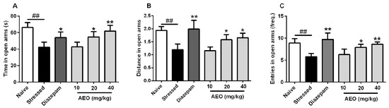 2.1. Effects of AEO on Restraint Stress-Induced Anxiety by the Elevated Plus Maze (EPM) Test in Mice