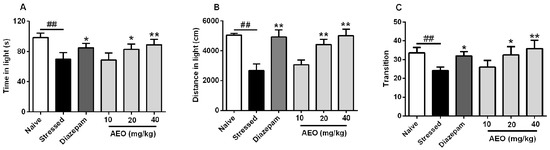 2.2. Effects of AEO on Restraint Stress-Induced Anxiety by the Light Dark Exploration (LDE) Test in Mice