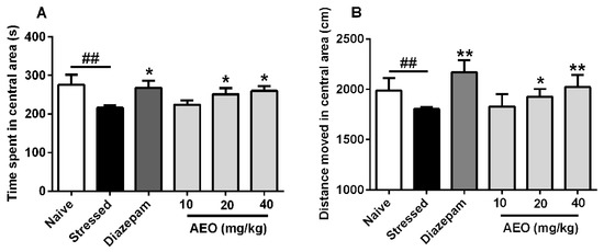2.3. Effects of AEO on Restraint Stress-Induced Anxiety by the Open Field (OF) Test in Mice
