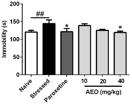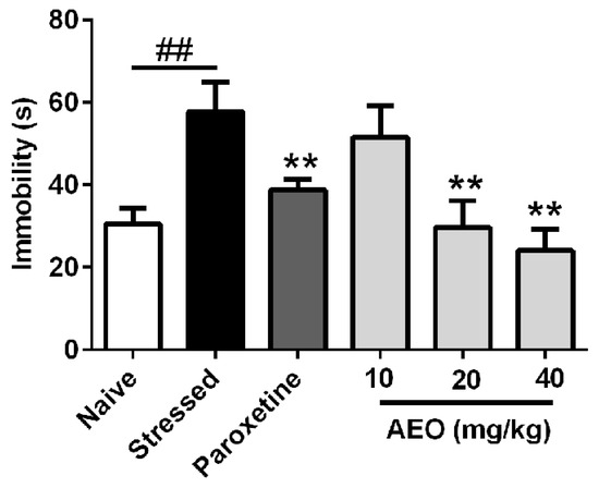 2.5. Effects of AEO on Restraint Stress-Induced Depression by the Forced Swimming (FS) Test in Mice