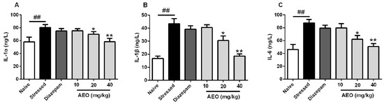 2.6. Effects of AEO on Inflammatory Cytokines in Restraint Stress-Induced Mice Serum