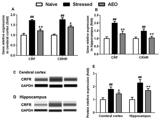 2.8. Effects of AEO on CRF and CRFR Expression in Mice Brain